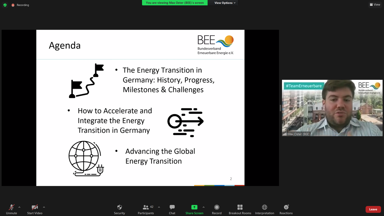 Sentyabrın 8-də ilkin virtual tədbir həyata keçirilib. AHK Azərbaycanın İcraçı direktoru Tobias Baumann açılış nitqindən sonra yüksək ixtisaslaşmış mütəxəssislər iştirakçılara enerji bazarının hazırkı tendensiyaları, əsas bazar oyunçuları və ən son texnologiyalar haqqında praktiki məlumatlar verib. Əsas müzakirə mövzuları Almaniyanın enerji keçidindən öyrənilmiş təcrübələr, eləcə də Azərbaycanın qarşısında duran çətinlik və imkanlar oldu. Alman şirkətləri ağıllı kəndlərin ən yaxşı nümunələrini də nümayiş etdirərək öz enerjisi ilə özünü təmin edə bilən Feldheim kəndini misal gətirib.